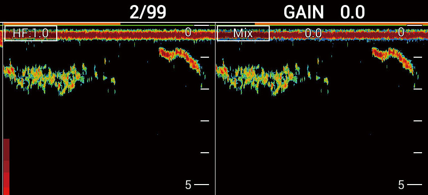 一个屏幕上最多可以显示四种不同频率的探鱼器信号。每种鱼的信号一目了然,