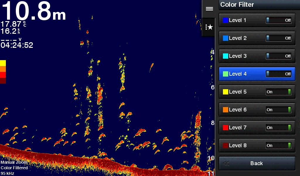 位移缩放功能可控制声纳图像的显示区域,将您关注的深度区域的详细画面锁定显示。色彩抑制功能可以将声纳画面仅显示几种较为简单的颜色。